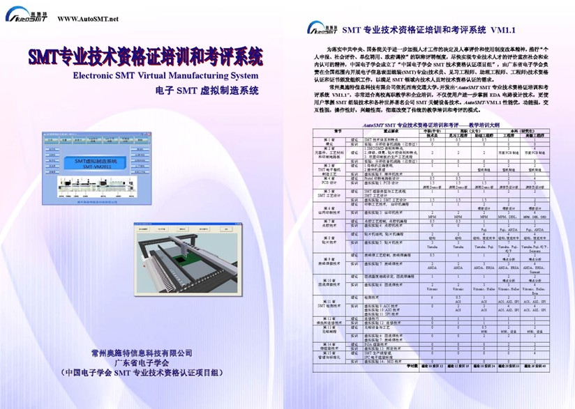 常州奧施特公司與廣東省電子學(xué)會(huì)(中國電子學(xué)會(huì)SMT專業(yè)技術(shù)資格認(rèn)證項(xiàng)目組) 合作成功開發(fā)出“AutoSMT SMT專業(yè)技術(shù)資格證培訓(xùn)和考評(píng)系統(tǒng)VM1.1” ,由廣東省電子學(xué)會(huì)負(fù)責(zé)在全國范圍內(nèi)開展電子信息表面組裝(SMT)專業(yè)(技術(shù)員、見習(xí)工程師、助理工程師、工程師)技術(shù)資格認(rèn)證和證書頒發(fā)組織工作,以滿足SMT領(lǐng)域內(nèi)技術(shù)人員對(duì)技術(shù)資格認(rèn)證的需求。